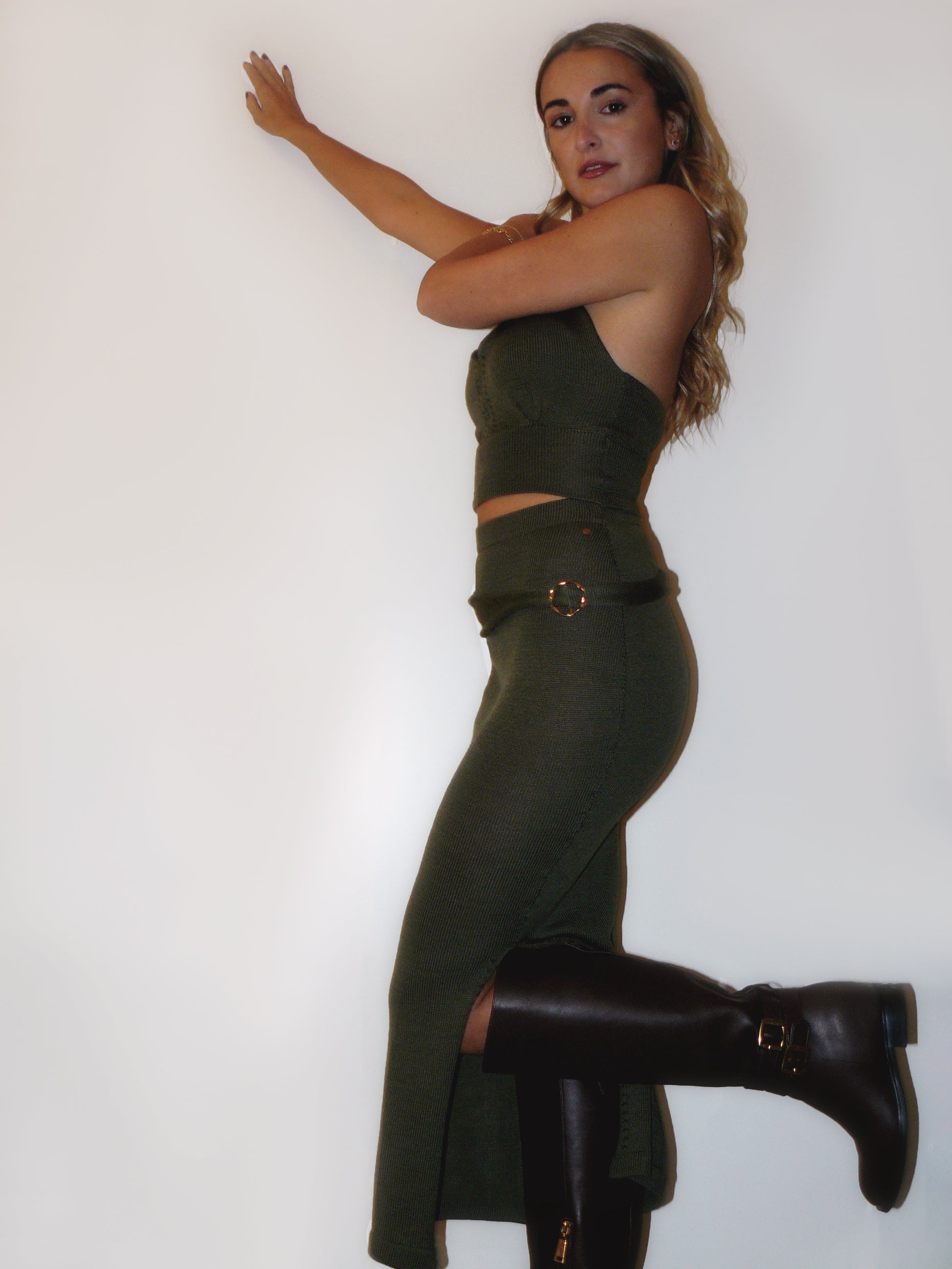 • Knitted waistband encircling the waist, finished with a golden ring accent